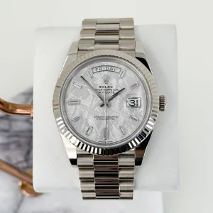 Rolex White Gold Day-Date 40 Watch – Fluted Bezel – Meteorite Baguette Diamond Dial – President Bracelet – 228239 mtdp