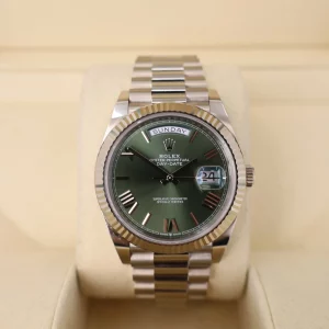 Rolex White Gold Day-Date 40 Watch – Fluted Bezel – Olive Green Bevelled Roman Dial – President Bracelet – 228239 ogrp