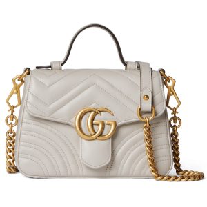 This GG Marmont mini bag features a full zipper design and top handles. The round shape is made of the series’ iconic white quilted V-shaped leather with Double G details. It also comes with a detachable chain strap, suitable for matching different styles.